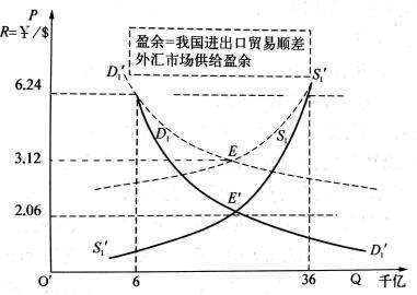 本國(guó)外匯市場(chǎng)赤字情形:D與S為美元(外匯)需求與供給彈性較大情形,美元貶值或升值引起外匯供需巨大變化,從而影響國(guó)際貿(mào)易發(fā)生巨大波動(dòng)。運(yùn)行過(guò)程解釋?zhuān)罕緡?guó)市場(chǎng)匯率的初始狀態(tài)為人民幣/美元R=0.15時(shí),外匯市場(chǎng)擁有8000億美元供給,而市場(chǎng)需求為12000億美元,缺口為4000億美元。表面看來(lái),人民幣貶值后,出口的增加可以彌補(bǔ)這個(gè)赤字。